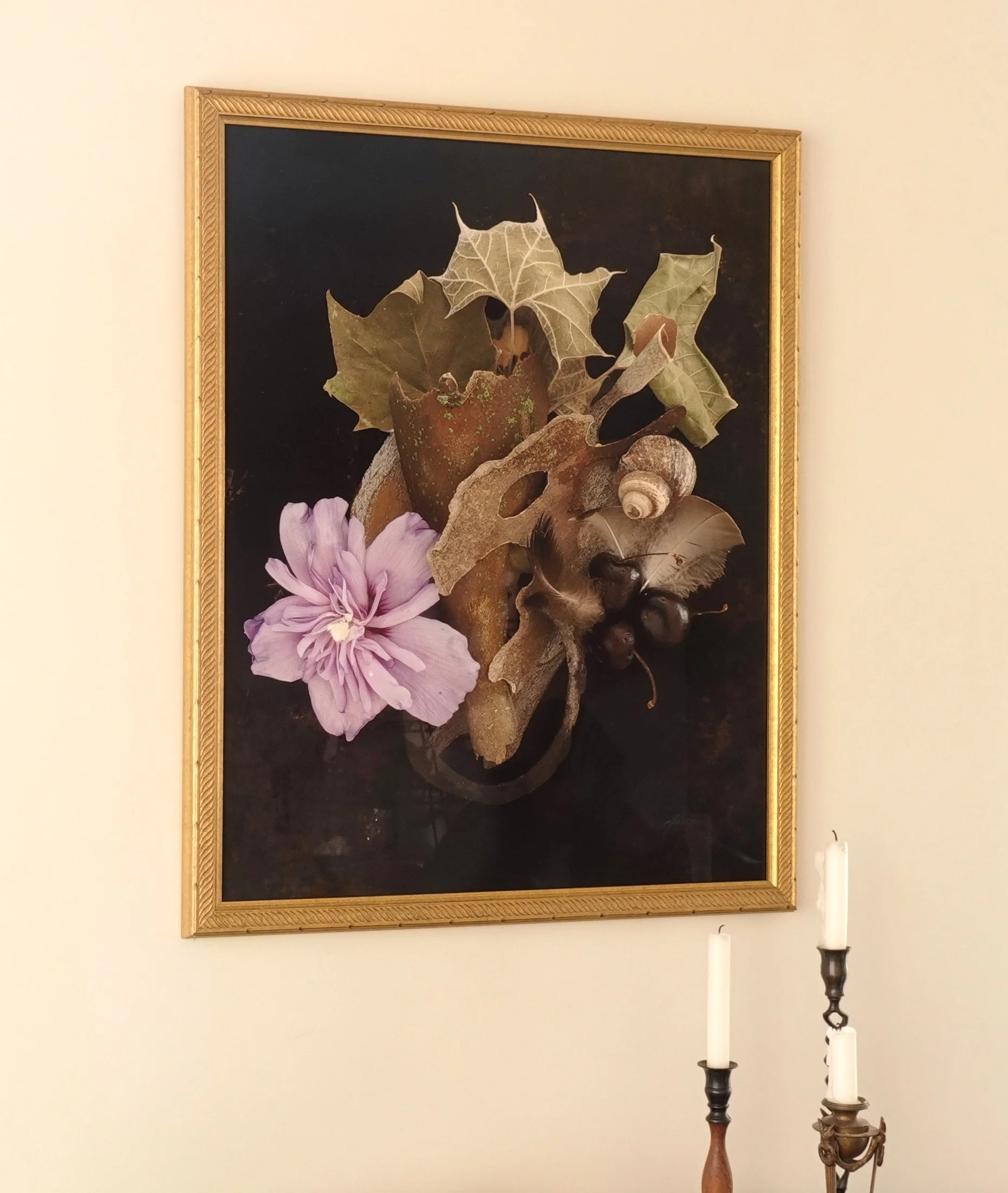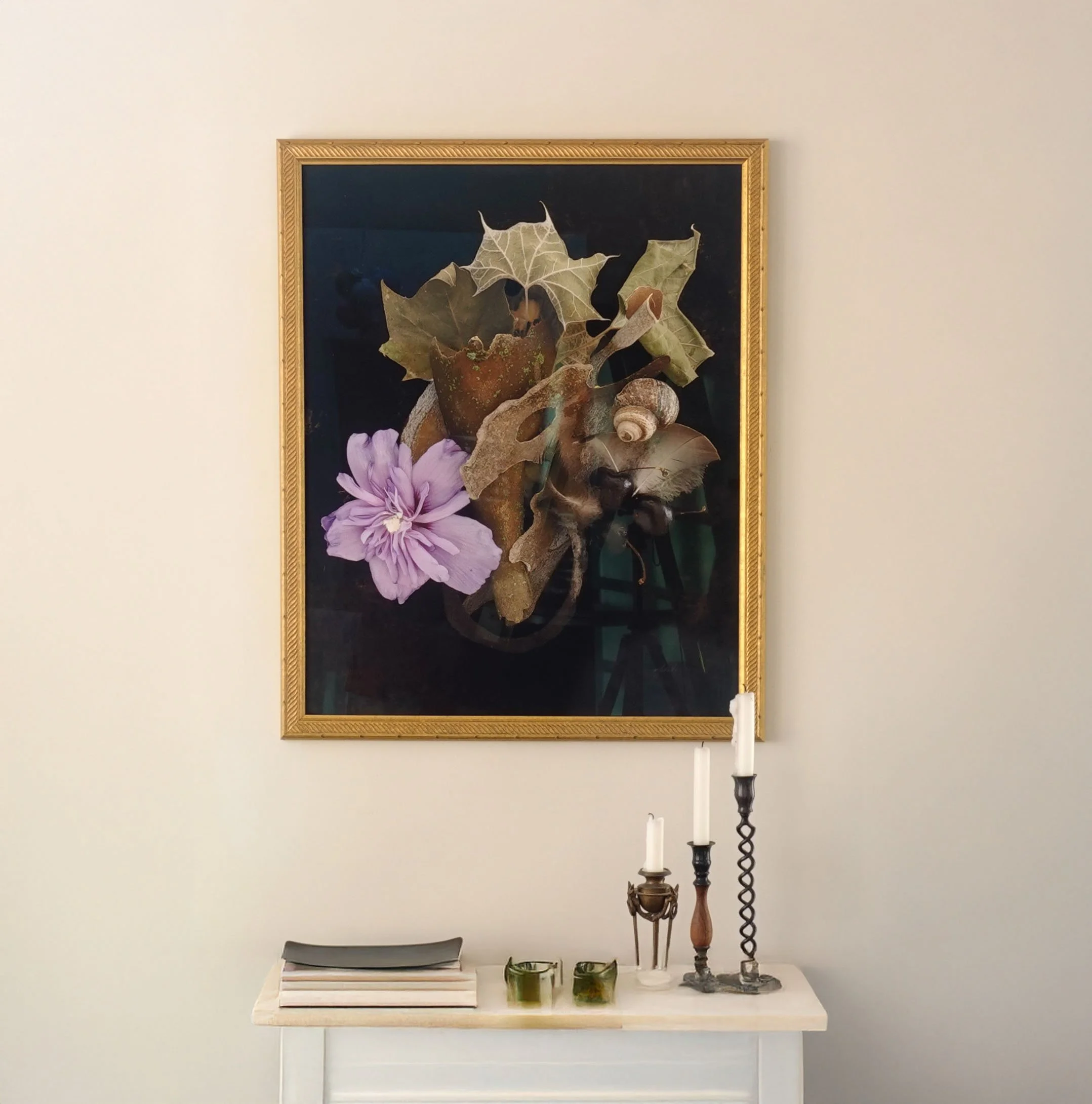 A softness resides in Soul Song; the delicate Rose of Sharon, vibrant and full of life, contrasts with brittle leaves, a weathered shell. Bark and fruit, rest in solemn beauty, their textures whispering of cycles yet to come.