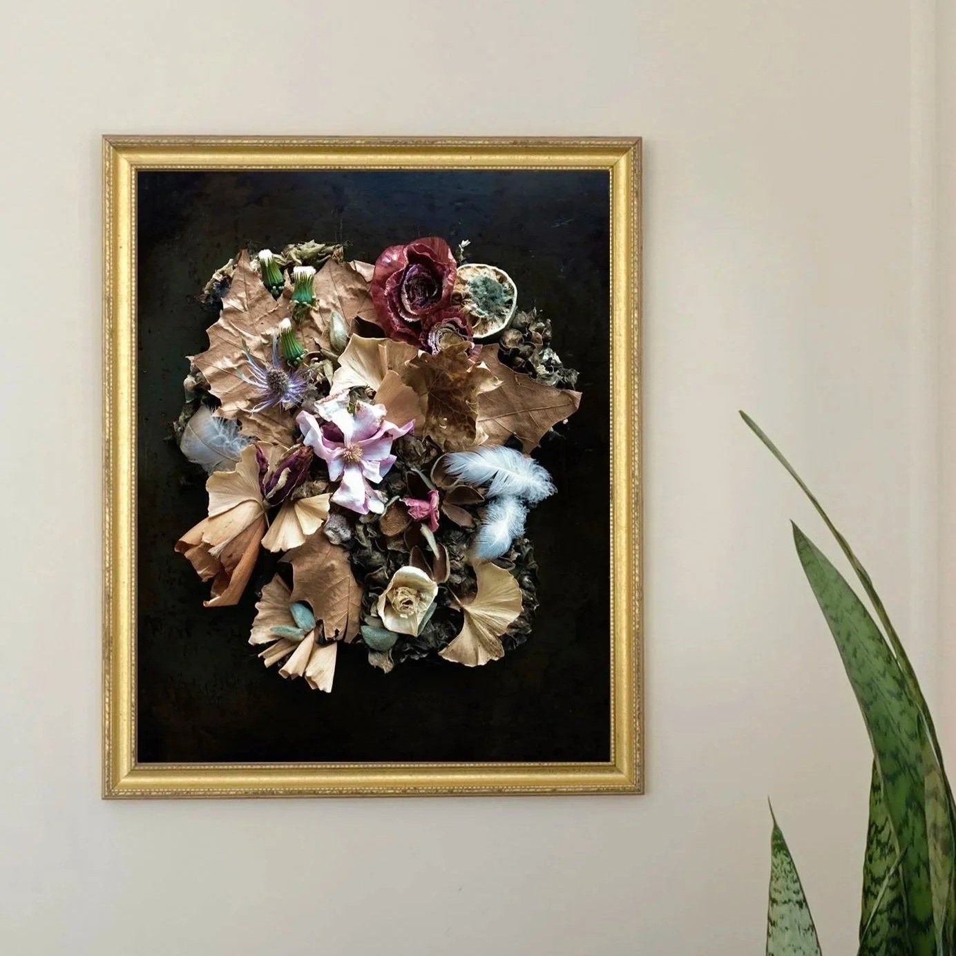 Honoring the tradition of Vanitas, inspired by 16th C Dutch still life painting; fallen leaves, dried petals, feathers, and decaying elements reflects on the beauty of change, the inevitability of decay, and the enduring cycle of life.